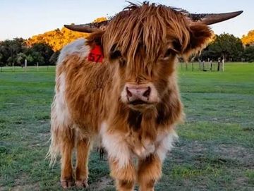 MINI-HIGHPARK, Highland-White Park, Chondro-Negative, 41 inches, Horned, Great genetics, Excellent color and hair, Add some fluff to your herd!